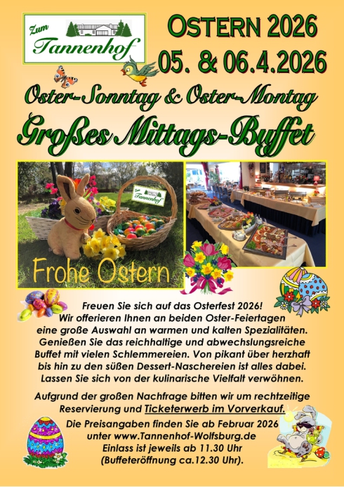 Oster-Sonntag und Oster-Montag offerieren wir Ihnen ein großes Oster-Mittags-Buffet mit vielen warmen und kalten Speztialitäten.